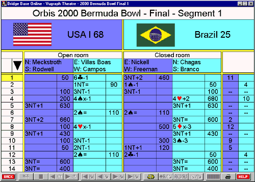 La lista dei matches e come selezionarne uno: Nei principali tornei è prevista dal vivo una sala Bridge Rama nella quale gli spettatori possono vedere su un grande schermo come è stata licitata e giocata al tavolo la mano.Bridge Base Inc. ha sviluppato per prima la tecnologia per riportare il Bridge Rama su internet, ed oggi sono disponibili grazie a questa metodologia i più importanti eventi del bridge mondiale. L'utilizzatore ha il controllo completo di ciò che desidera osservare. Nella sala "Vugraph Theatre" apparire una lista con tutti i matches disponibili. La barra di scorrimento posta sulla destra vi permette di scorrere la lista stessa; selezionate il matche cliccandoci sopra ed apparirà lo score di quel match. Come utilizzare il "Vugraph match": Lo score: Nello score è visualizzato il risultato di tutti i board del match. Nell'esempio seguente è riportato un esempio di un incontro con punteggio IMP; per un torneo a coppie, o altre tipologie di incontri lo score è lievemente diverso.